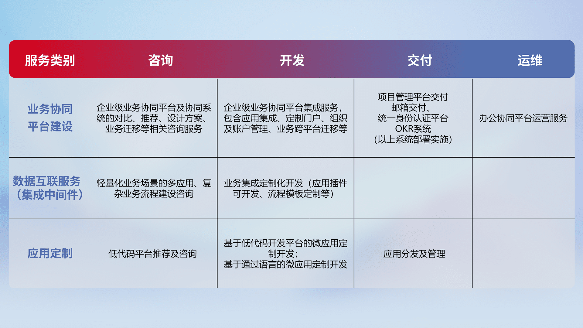 针对钉钉、、、、企微、、IDaas等平台级产品提供产品的规划、、方案、、、、交付、、定制化开发等服务,,,实现如统一协同办公、、、智能客户服务、、混合会议管理、、、智能数据查询、、、、等业务场景,,,,实现数字化转型。。。。